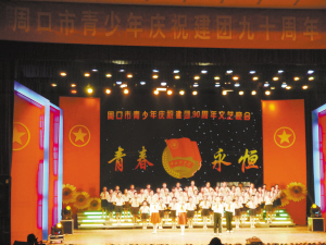 昨晚,由团市委、市青联联合举办的“青春永恒”周口青少年庆祝中国共青团建团90周年文艺晚会在周口人民会堂举行,近1400名周口青少年齐聚一堂共同庆祝建团90周年。据了解,该晚会是团市委为庆祝建团九十周年所举办的系列活动之一。晚报记者 张燕 摄