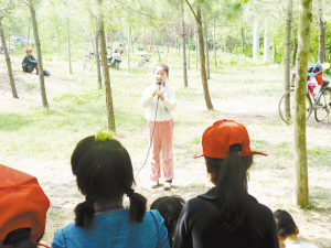 临近中午,我们又来到了下一个活动场地。老师让我们坐下来先吃午餐。我拿出饼干、面包和饮料,和小伙伴们一起有说有笑地吃起来。饭后,我们开始进行第二个项目——击鼓传花。当鼓声停时,花落在谁的手中,谁就要给大家表演一个节目。这个游戏锻炼了小记者的胆量。