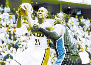 5月9日,步行者队球员韦斯特(左)在比赛中突破上篮。当日,在2011/2012赛季NBA季后赛首轮比赛中,印第安纳步行者队以105比87战胜奥兰多魔术队,总比分4比1晋级下一轮。