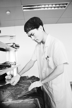消毒供应中心,听上去虽然与“扎针、擦药、白衣天使”不太相关,但在这里工作的必须是具有专业护理资格的专业护士,它相当于战场的“总后勤部”。这里的护士不但要知道医疗一线打针、擦药需要什么设备,还必须清楚地知道什么样的手术需要什么样的剪刀、钳子等等。记者看到,在供应室里,各式各样的剪刀、钳子、镊子、针头、刀片可以用数以千计、琳琅满目来形容,11位护士只有吴昊1人是男性,对医疗设备分拣、配备、消毒、打包,他们的动作娴熟、有条不紊。