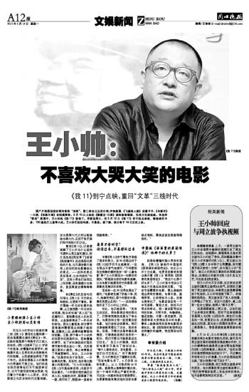 同是性懵懂时期小男孩的视角,《我11》被称作中国版的《西西里的美丽传说》,对此王小帅十分反感,他更无法接受有观众表示看《我11》联想到《西西里的美丽传说》,“我这个比那个好太多了。”王小帅至今无法认可商业片的某些法则和元素。“现在市场需要的电影,要么是能把观众弄笑的喜剧,如果不是,就得弄哭,让你带纸巾入场。这都太简单化了,电影应该还有一个中间段落,看完之后,你找不出哭点和笑点,我一直试图寻找这样的知音,不哭不笑,冷静理性,隐忍控制。不要一悲伤就哭,而是那种有大悲悯在其中的电影。事实上能够流传的经典电影很多是如此。像《西西里的美丽传说》这种廉价的煽情,我觉得没任何意义。”