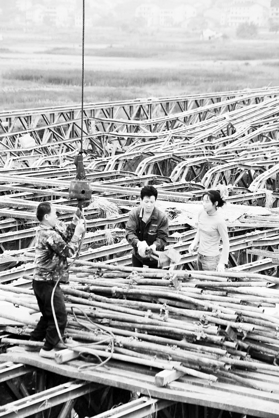 5月13日,施工人员在娄底市涟水河大桥桥面坍塌处进行卸载拆除工作。 目前,湖南省娄底市涟水河大桥(三大桥)坍塌处的桥面已完成爆破拆除,并开始对9号桥墩的加固作业。据桥梁施工方介绍,坍塌处修复需3个月左右,涟水河大桥预计2012年年底竣工通车。 3月12日,正在建设中的娄底涟水河大桥跨河段第十跨桥面突然发生垮塌,随后大桥被停工、封闭。新华社发