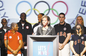 当地时间5月14日,美国第一夫人米歇尔·奥巴马(前)在达拉斯举行的伦敦奥运会美国体育代表团媒体峰会上讲话,为奥运选手打气助威。米歇尔·奥巴马将率美国总统代表团出席今夏伦敦奥运会的开幕式。