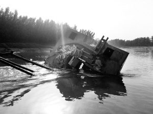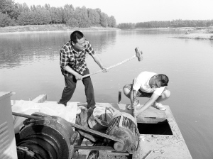 就在执法人员凿沉这艘船的同时,附近另外一艘采砂船的主人召集不少人正在往岸上拉船。“昨天下午就通知他们把船拖上岸,他们就是不听,现在拖已经晚了。和第一艘船一样,凿沉。”市水政监察支队支队长薛显允吩咐执法人员。20分钟后,这艘船和第一艘船一样也沉入河底。