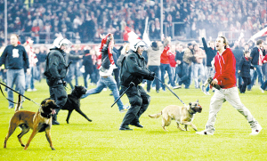 5月15日,德国警察带着警犬入场维持秩序。当日,在德甲德乙升降级附加赛第二回合比赛中,杜塞尔多夫队主场以2比2战平柏林赫塔队,最终以4比3的总比分战胜对手,在阔别15年后重返德甲。比赛即将结束时疯狂的杜塞尔多夫队球迷引发的骚乱使比赛一度中断。