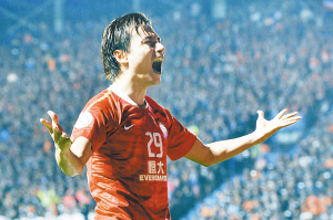 广州恒大队球员郜林在打进第一球后庆祝