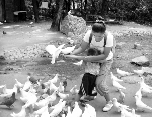 啊,鸽子要啄到我了,妈妈你快让我跑。