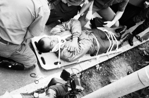 5月16日,救援人员在巴西圣保罗列车相撞事故现场运送伤员。