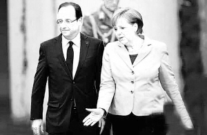 法国总统奥朗德上任第一件事就是飞往德国与德国总理默克尔举行首次会晤,欧洲两大核心国从此迎来“默朗德”组合。英国《每日邮报》称,初登高位的奥朗德应该会对在他外交处女秀上伸出援手的默克尔心怀感激。柏林当地时间16日,德方举行了盛大的欢迎仪式迎接奥朗德,但这位紧张的新总统几乎在红地毯上找不着北,幸得富有耐心的默克尔一而再、再而三给他指路。
