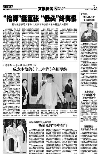 本报综合消息 由成龙领衔主演的《十二生肖》片方于5月18日在戛纳召开发布会,现场不仅有“十二兽首”震撼亮相,同时也发布了影片首款预告片“巴黎涉险”。戛纳电影节为了表示对成龙的尊敬和对《十二生肖》的欢迎,特地在当天晚上特别放映经典影片《A计划》,令影迷即刻重温成龙动作电影的特殊魅力。