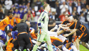拜仁慕尼黑队守门员诺伊尔在点球大战后走向自己的队友