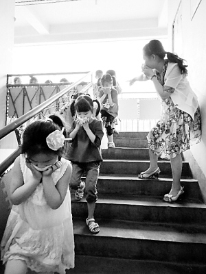 周口市第三幼儿园作为川汇区唯一一所公办幼儿园,多年来一直靠租赁校舍办园,尽管条件有限,但该园严格执行国家规定的收费标准,始终把幼儿安全作为办园的重中之重,注重内部制度化管理,不断丰富各项教学内容,深受广大市民及幼儿家长的赞誉。图为第三幼儿园教师在指导幼儿进行消防应急知识演练。(倪爱华 摄)