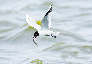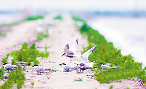 堤内的人工海塘成了黑嘴鸥和普通燕鸥的伊甸园,在纵横交错如阡陌般的机耕路上,燕鸥们找到了几处柔软的沙地来歇息,御风而翔的翅膀无论怎样坚韧,都需要暂时收拢,大自然的喜怒无常足以让所有的生灵敬畏。雷雨骤至,雨点粗暴地击中沙地,溅起水和灰混合的薄薄帷幕,这个时候还在飞行的,或许只有黑嘴鸥了,它们似乎永远填不饱自己的肚子,而海塘里的鱼几乎唾手可得。它们一次次的俯冲下去,然后,大餐到嘴。它们甚至还将奄奄一息的鱼儿重新丢回水里,反复戏弄一番,才吞进肚里。燕鸥们越来越多地聚集在一起,“啾啾”的低鸣声在风雨中摇曳。雨滴从它们蓝灰色的羽毛滑落到粉红色的脚上,再融入大地……