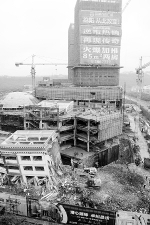 绵阳紫荆民族中学位于绵阳市涪城区花园路附近,这里正对着绵阳火车站,属于当地较为繁华的商业中心,周边人流、车流量较大。记者看到,这里已经建起一大片商业设施,许多楼都接近封顶。学校原址已经被围板围起,一幢教学楼严重倾斜,正在实施拆除。周边不少商户告诉记者:学校去年底就没使用了,拆除是这几天开始的。