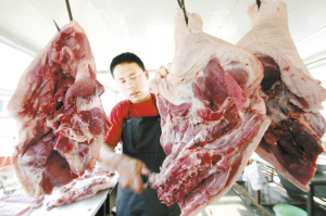 5月24日,在一家农贸市场,一名摊主在分解待售的猪肉。