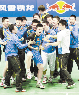 本报综合消息 北京时间5月27日,2012年世界羽联汤姆斯杯在武汉鸣金收兵,中国队成功卫冕实现汤杯五连冠。在与韩国队的决赛中,林丹首场2比0横扫李炫一为球队拿到开门红,蔡赟/傅海峰和谌龙也都以直落两局的表现获胜,中国队3比0击败韩国队第9次夺取冠军,并实现首个五连冠追平印尼队的纪录。