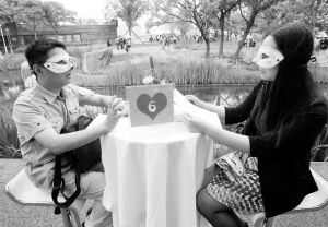 5月26日,单身男女在上海第二届婚恋博览会上参加“面具下午茶”交流活动。