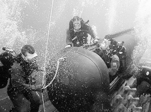目前“海豹”突击队采用的水下运输器长16米,艇壳用高强度玻璃钢制造,可以规避磁性水雷的威胁。它用电机提供动力,两名艇员驾驶,可运送8名特种兵。水下运输器可被固定在核潜艇甲板,艇腹部有一个密填舱口与核潜艇上甲板口对接,人员由此出入核潜艇与运输器之间。而研发测试中的S301微型潜艇,长仅7.6米,重仅13吨,下潜深度超过180米,也可搭载8名乘员。