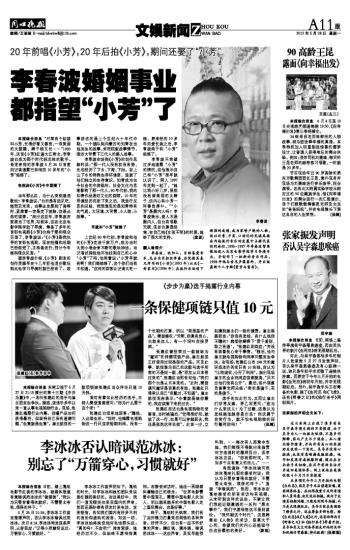 李春波不希望过多地透露“小芳”的情况,但他表示自己和“小芳”很早就认识了,两人1997年走到一起了。“她比我小好几岁,虽然没有留美丽的大辫子,但内心和小芳一样善良淳朴。”“小芳”是圈内人吗?李春波表示,爱人不是圈内人,但也有唱歌天赋,现在也算是经商,在自己拍《女孩不哭》的时候,她给了很大的支持。 (袁波)