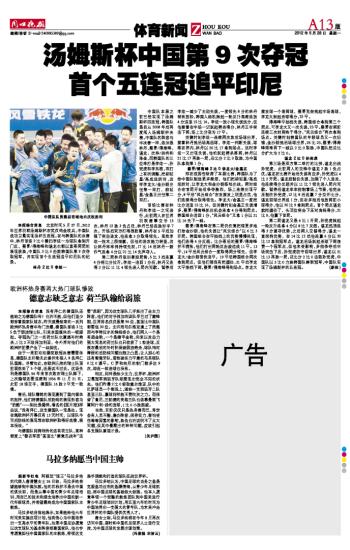 汤姆斯杯中国第9次夺冠