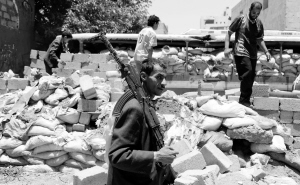 5月28日,在也门首都萨那,当地居民与政府军士兵拆除武装冲突中各派设立的防御工事。
