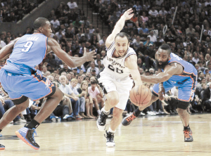 5月30日,马刺队球员吉诺比利(中)在比赛中带球进攻。当日,在2011/2012赛季NBA季后赛西部决赛第二场比赛中,圣安东尼奥马刺队主场以120比111战胜俄克拉荷马雷霆队,总比分2比0领先。