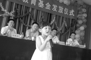 5月31日上午,河南亿星实业集团有限公司向职工子女发放成长教育基金,在六一儿童节到来之际启动了关注员工子女的“阳光工程”。据了解,亿星集团职工子女成长教育基金包括成长营养配餐基金、教育奖励基金和教育升学奖励基金,其中面向0至6岁职工子女的成长营养配餐基金按月发放,每月100元。图为员工子女代表范墨晗在基金发放仪式上作代表发言。晚报记者 李伟 摄