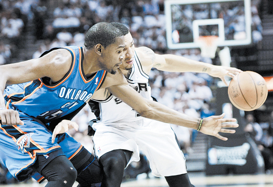 6月5日,雷鸣队球员杜兰特(左)在比赛中抢球。 当日,在2011/2012赛季NBA季后赛西部决赛第五场比赛中,圣安东尼奥马刺队主场以103比108不敌俄克拉荷马雷霆队,总比分以2比3落后。 新华社记者杨磊摄