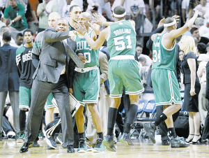 战至最后52秒时,全场19投仅6中的皮尔斯用三分球把本队领先优势扩大到4分,这一球瞬间把热火投进水深火热当中。在查莫斯三分球投偏后,只剩15秒时间的热火只好打犯规战术,可阿伦和加内特的精准罚篮不给主队一点反扑可能。随着韦德最后5秒三分远投“打铁”,热火只好吞下主场失败苦果。