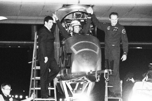 6月5日,瑞士太阳能飞机“太阳驱动”号飞行员皮卡尔(中)抵达摩洛哥的拉巴特—萨累机场。 瑞士太阳能飞机“太阳驱动”号于当地时间5日深夜徐徐降落在北非国家摩洛哥的拉巴特—萨累机场,标志着人类历史上第一架太阳能飞机完成跨越欧非大陆之旅。 “太阳驱动”号自2010年4月7日首飞成功后,于当年7月实现昼夜试飞,在去年5月首次完成瑞士至比利时的跨国飞行