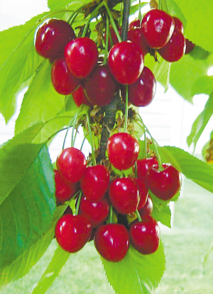 我姥姥家有一棵樱桃树,树上有很多已经熟透了的樱桃。
