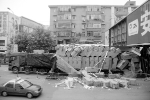 当日6时许,记者赶到事发现场,发现一辆外地牌照的货车尾部卡在天桥下,冰箱散落一地。驾驶该大货车的司机刘某说,他所装货物连车带货总高度在4.7米至4.8米之间,一般过桥限高为4.5米,而实际所建高度都在4.8米至4.9米之间,他所驾车辆应该勉强能过去。“我开到这里时,看到了巨幅广告牌,有点大意了,没注意限高标志。”司机刘某一脸沮丧地说。