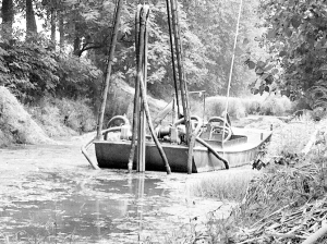 情况果真像崔月望所说吗?当日上午11时许,记者再次来到这个非法采砂点。只见坑塘两岸砂堆如山(如图一),一艘采砂船停靠在坑塘一角,部分装备卸下,另一艘采砂船“躲”在坑塘一角的小沟里,船上采砂装备基本齐全(如图二),随时可以作业。