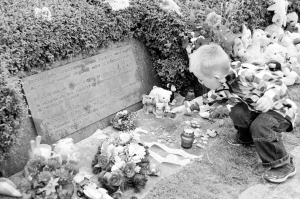6月10日,在捷克布拉格附近的利迪策村,一个小朋友把自己心爱的小汽车放在死难儿童纪念碑前。