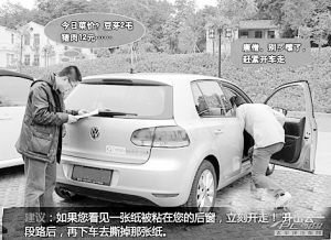 防盗招数:需警惕的是,这种偷车方式往往针对女性车主较多,所以遇到这种情况,建议车主不要当时下车撕纸,待开出一段距离后,再下车去撕掉那张纸。