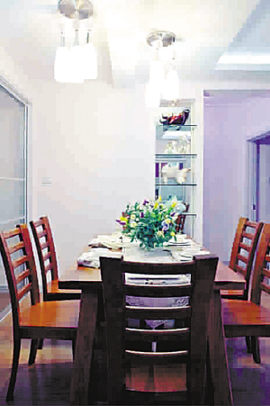 客厅:精致的餐具、桌旗、鲜花与拥有天然色泽的原木桌椅交相辉映,似乎在讲述一个故事,讲述一个如何能在用餐时细细品味家的味道的故事(A)。