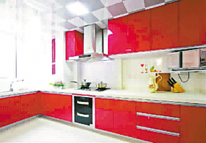 厨房:橱柜门玫瑰红的色调很有喜庆的感觉,当阳光照射进来,可爱的假花装饰与瓶瓶罐罐便能在红色的映衬下,呈现出清新、浪漫的画面(C)。(新民)