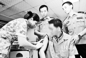 6月12日,服刑人员高某(中)在狱警的监管下接受新桥医院护士注射激发干细胞的动员剂。