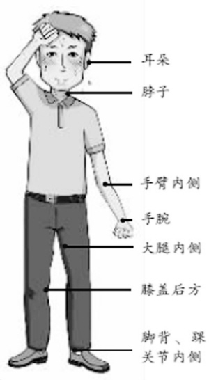 这些部位一般都是动脉或血管密集的地方,可迅速降低血液温度,带走体内多余热量。主要有以下几个部位:耳朵、脖子、手臂内侧、手腕内侧、大腿内侧、膝盖后方、脚背、踝关节内侧(如上图)。其中脖子和手腕是最佳降温点。感觉热时,用冰袋或者其他低温物放在这些降温点上,或是用凉水冲3~5秒,不一会儿就能驱散热气了。(龚蕊)