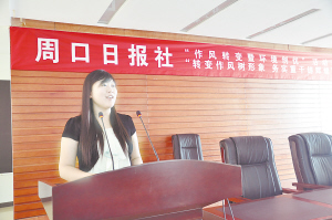 本报讯 “‘作风转变暨环境创优’活动意义深远,对报人来说是教育、是告诫,对广大读者来说,是公示、是承诺……”6月14日上午,周口日报社举行“作风转变暨环境创优”活动转段动员大会,以一场“转变作风树形象、务实重干铸辉煌”演讲报告会拉开了查摆问题阶段的序幕。演讲中,本报记者姬慧洋如是说。
