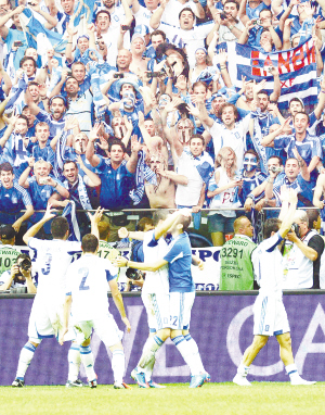 深陷债务危机的希腊仅仅来了4000名球迷,而全场超过2万名俄罗斯球迷让华沙国家体育场变成了俄罗斯人的主场。然而,希腊队场上的11名球员却远远比对手更有胜利的渴望。开场第6分钟,希腊队就率先发难:为国家队120次出场的卡拉古尼斯开出角球,萨尔平吉迪斯的射门被俄罗斯守门员马拉费耶夫没收。此后,扎戈耶夫的两次射门一次被门将化解,一次高出横梁。守住平局即可出线的俄罗斯并不着急,希腊队却不愿意放过任何一个可能的机会,终于,在上半场补时第2分钟,主裁判已经开始看表的读秒阶段,希腊队掷出界外球,卡拉古尼斯突然前插禁区内大力低射破门,希腊取得了本届欧锦赛第一次领先。