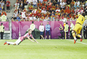 凭借着替补登场的纳瓦斯在第88分钟的绝杀,西班牙有惊无险地以C组头名昂首挺进八强。抛去进球功臣不说,西班牙得以从格但斯克市政竞技场笑着走出来,还要感谢他们的“门神”、队长卡西利亚斯。在比赛第59分钟,“格子军”打出了一次最犀利的反击,直插入西班牙腹部阵地。游弋在右路的摩德里奇一脚技惊四座的外脚背传中球,几乎让斗牛士们的后防线顷刻间化为乌有。拉基蒂奇成为了这次传中的获益者,他在后点无人防守的情况下,在禁区左肋鱼跃头球轰门。当所有的人都以为这球将会改变场上比分的时候,奇迹的一幕出现了:卡西利亚斯战胜了5米的距离,神勇地将球扑了出来!拉基蒂奇随后跟上的补射,又再次被“圣卡西”拒绝。BBC在目睹了卡西的这一壮举后惊讶道:天啊!卡西简直就是一座不可逾越的高峰!而《马卡报》则在比赛直播中表示:“卡西用自己的实际行动,为西班牙全体队员做了表率,他出色的表现力保球门不失。”