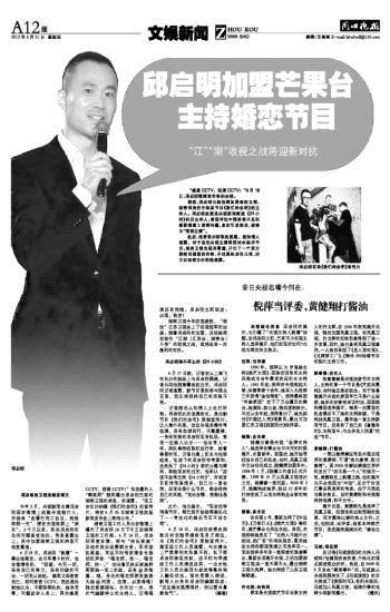 湖南卫视今年收视疲软,“宿敌”江苏卫视坐上了收视冠军的宝座。随着邱启明的加盟,这场被网友称作“江湖(江苏台、湖南台)斗争”的收视之战,或将迎来一次激烈的对抗。