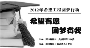 从今天起,由本报和共青团周口市委联合主办、本报《海龙帮办》栏目承办的2012年希望工程圆梦行动“希望有您 圆梦有我”正式启动。本报呼吁爱心企业、爱心人士踊跃参与,把那些品学兼优而又有可能与大学失之交臂的贫困学生送进大学。