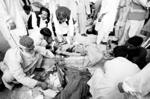 6月23日,在巴基斯坦西南部城市奎达,亲属们在医院内清理遇难亲人遗体。