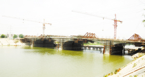 昨天,周口沙颍河八一大道桥正在紧张建设。目前,大桥已进入合龙施工,预计7月初完成合龙,保证按期建成通车。 晚报记者 朱海龙 摄