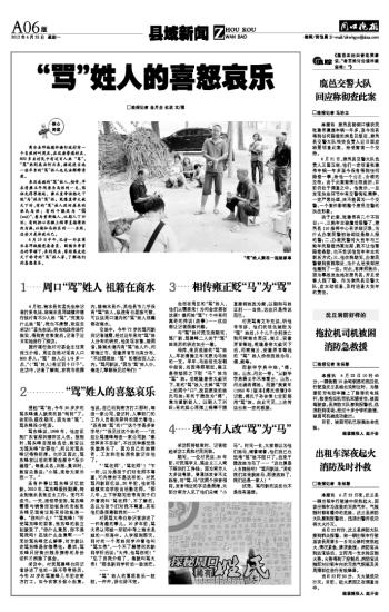 6月初,商水县的孟先生给记者打来电话,称商水县邓城镇许楼行政村有不少人姓“骂”,“究竟为什么姓‘骂’,我也不清楚,欢迎去采访!”孟先生说。向当地政府进行核实,得到肯定答案后,记者于近日实地进行了探访。