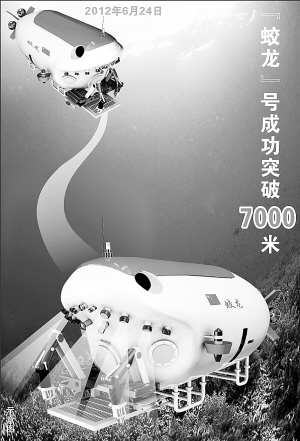 承载中国探索海洋的深蓝梦想,“蛟龙号”载人潜水器6月24日成功探海突破7000米,给人们带来无限振奋。