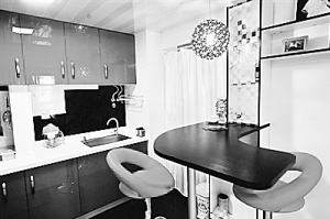 如果客厅与厨房之间为非承重墙,可以根据喜好改造成开放式厨房。如果户型合适,还可以在转角处、或厨房与客厅相接处设计一个迷你吧台。除了可作调配饮料和放置杯盘、水果之处,吧台下层相当于一个中型储物柜,无论是美酒、书籍,还是其他收藏品,都可以摆放妥当。