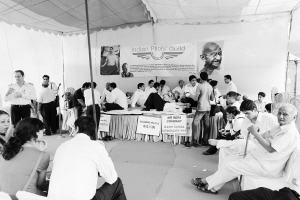6月24日,在印度首都新德里,一些印度航空公司飞行员参与绝食抗议。 印度航空公司的部分飞行员当天在新德里开始进行无限期绝食抗议,要求管理层召回被解雇飞行员并提高飞行员的待遇。 新华社记者 李毅刚 摄